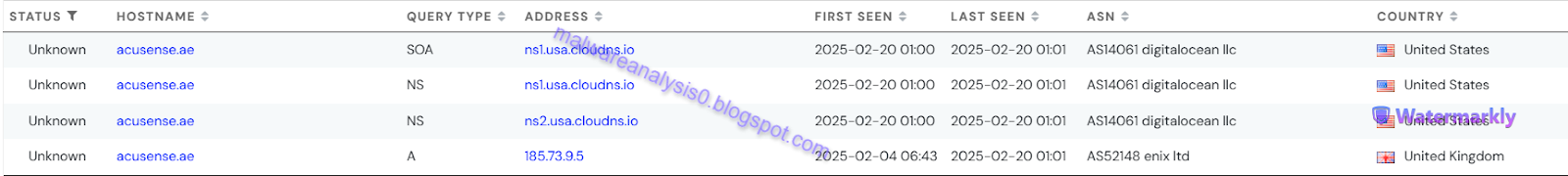 The C&C domain acusense[.]ae has been registered by Cloudns[.]io and for the Certificate subject we can see a mysitepreview.co.uk domain:
